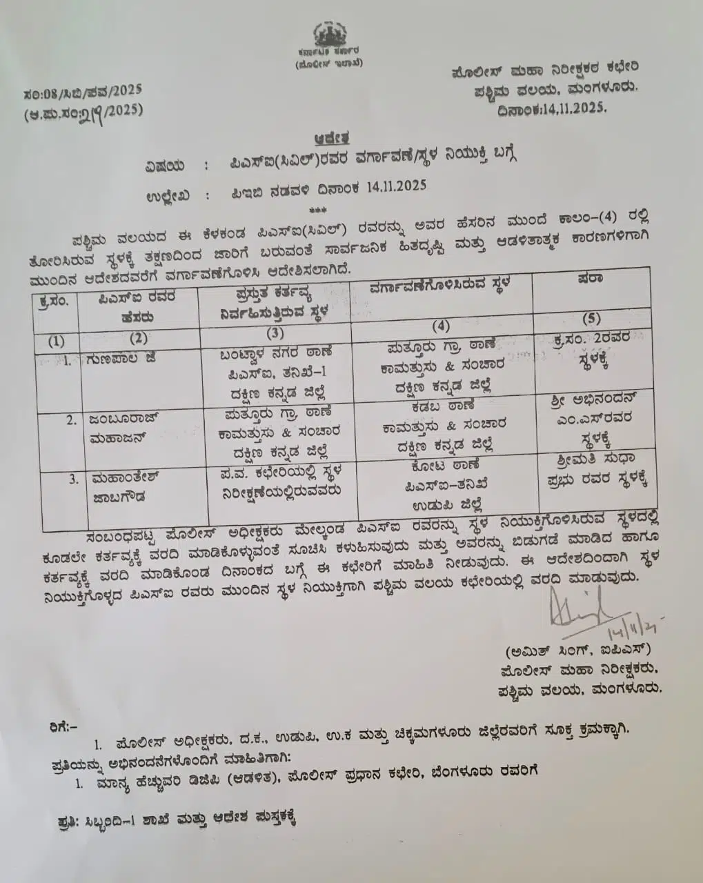 ಪಶ್ಚಿಮ ವಲಯ ಕಚೇರಿಯಲ್ಲಿ ಸ್ಥಳ ನಿರೀಕ್ಷಣೆಯಲ್ಲಿದ್ದ ಮಹಾಂತೇಶ್ ಜಾಬ ಗೌಡ ಅವರನ್ನು ಉಡುಪಿಯ ಕೋಟ ಠಾಣೆ (ತನಿಖೆ)ಗೆ ವರ್ಗಾವಣೆ
