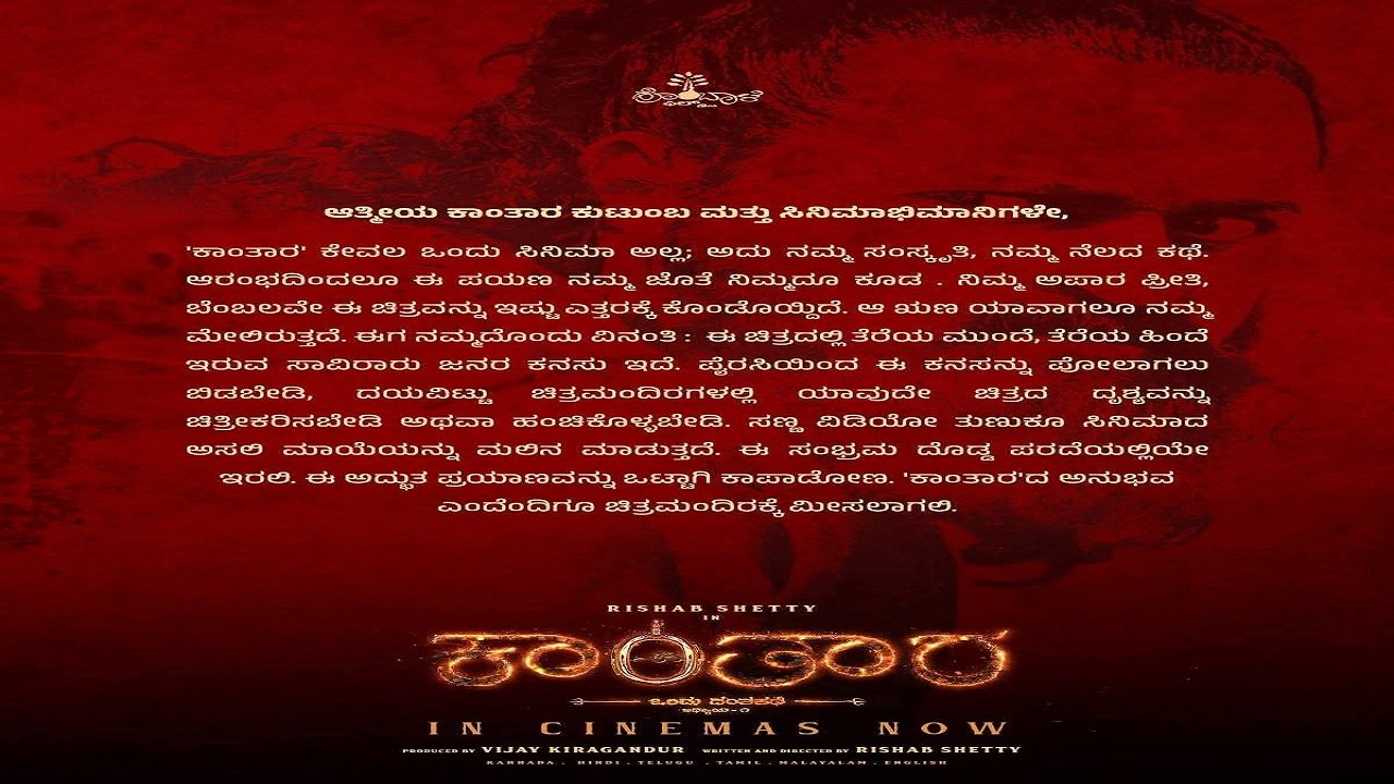 ಸಾವಿರಾರು ಜನರ ಶ್ರಮವನ್ನು ಪೈರಸಿಯಲ್ಲಿ ನೋಡಬೇಡಿ.ದೊಡ್ಡ ಶ್ರಮವನ್ನು ಪೈರೇಟೇಡ್ ಕಾಪಿಯಲ್ಲಿ ನೋಡಿ ಹಾನಿ ಮಾಡಬೇಡಿ ಎಂದು ಪ್ರೇಕ್ಷಕರಲ್ಲಿ ರಿಕ್ವೆಸ್ಟ್ ಮಾಡಿಕೊಂಡಿದೆ.ಅಂದಹಾಗೆ ಕಾಂತಾರ ಚಾಪ್ಟರ್ 1 ನಂತಹ ಸಿನಿಮಾಗಳನ್ನು ಪೈರೆಸಿ ಕಾಪಿಗಳಲ್ಲಿ ನೋಡಿದ್ರೆ ಆ ಸಿನಿಮಾದ ನಿಜವಾದ ಸ್ವಾರಸ್ಯ ಲಭಿಸುವುದು ಕಷ್ಟ.